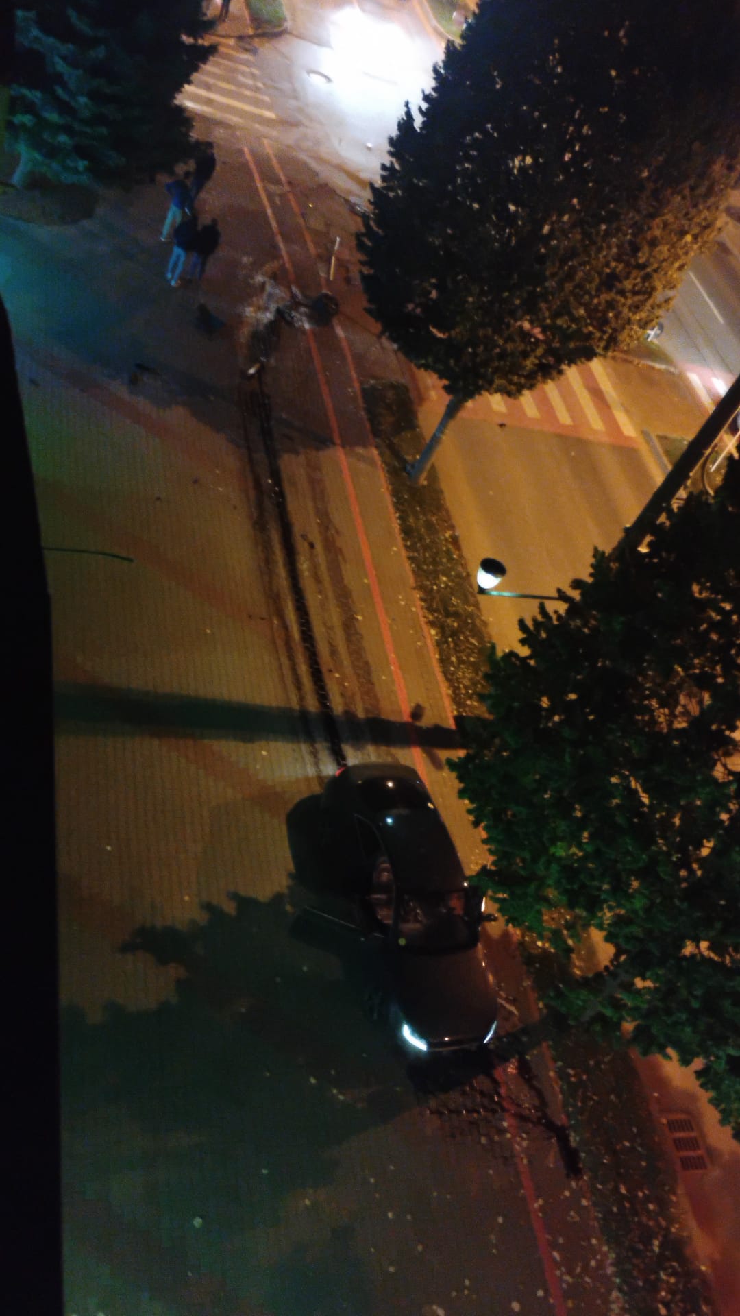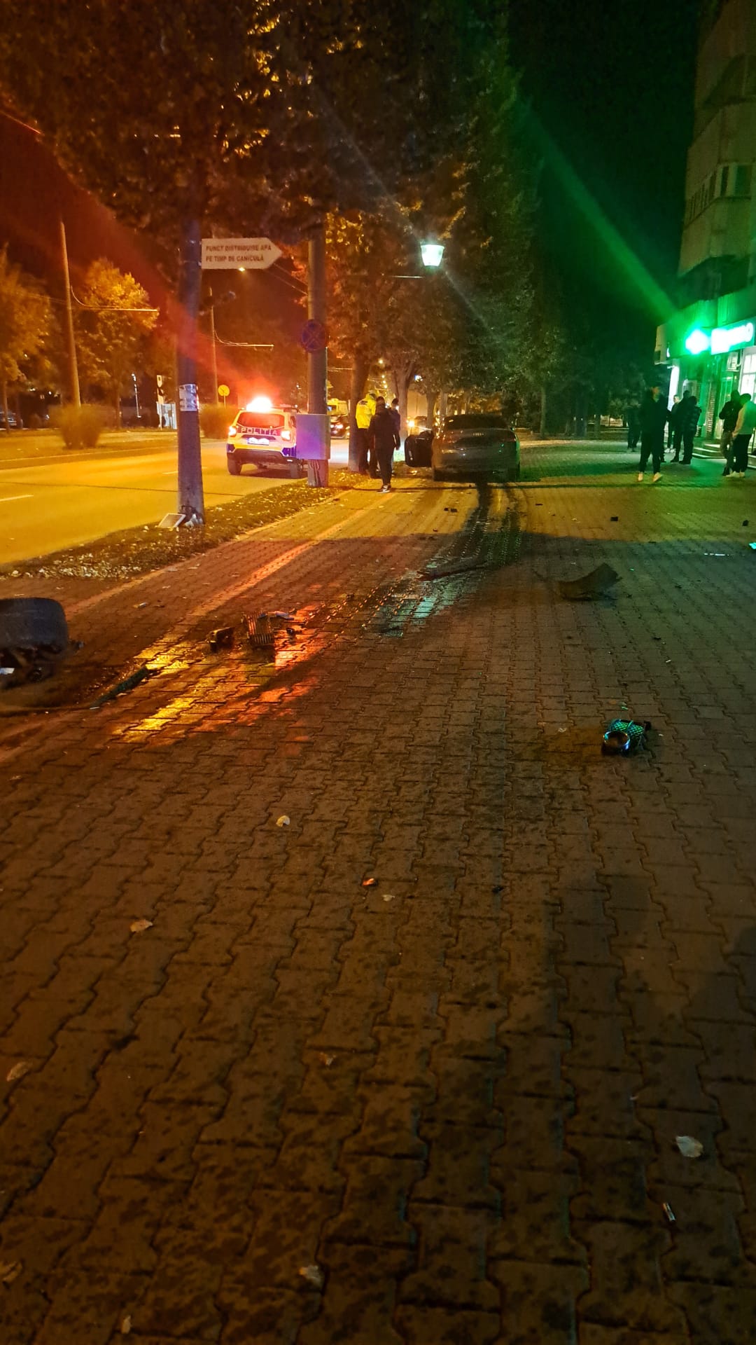 Mașina a rămas pe trotuar, cu partea din față distrusă, iar roata desprinsă a fost proiectată la câțiva metri distanță. Din fericire, nicio persoană nu a fost rănită, deși în zonă se aflau pietoni.