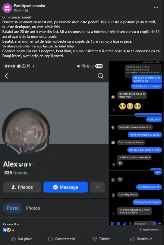 O postare publicată recent pe grupul de Facebook „Ești din Iași dacă…” a stârnit îngrijorare și reacții puternice din partea comunității. Autorul, care a ales să rămână anonim, susține că un bărbat din Iași ar fi întreținut, în trecut, relații sexuale cu o minoră și ar comunica în prezent cu o altă adolescentă de 15 ani.