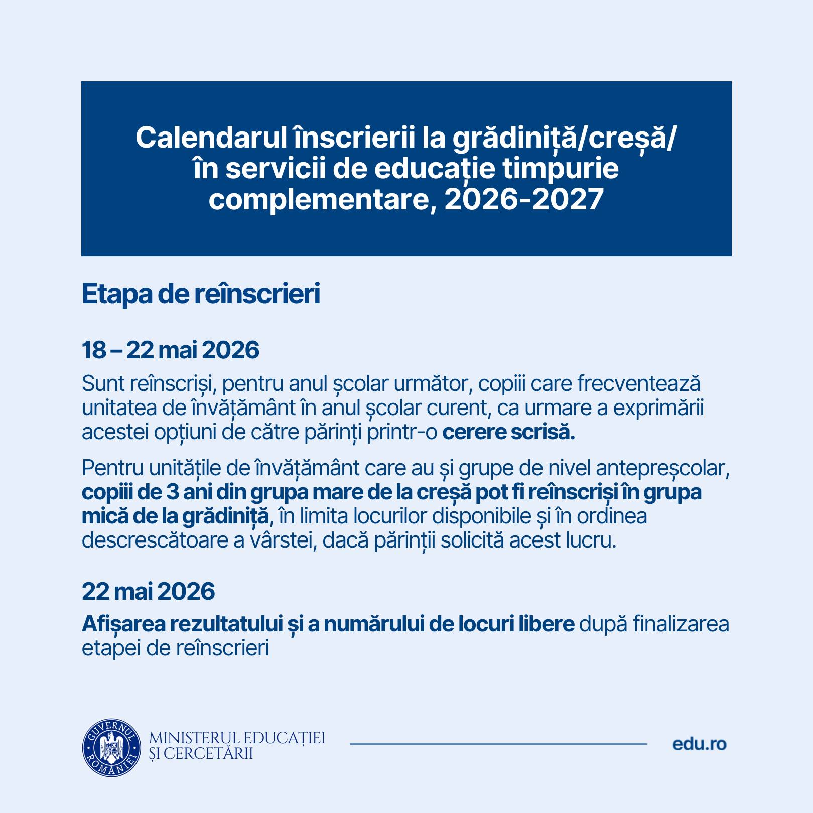 Reprezentanții ministerului explică faptul că etapa de reînscrieri este destinată copiilor care frecventează deja o creșă sau grădiniță. În această etapă, părinții își exprimă opțiunea pentru continuarea frecventării și în anul următor.