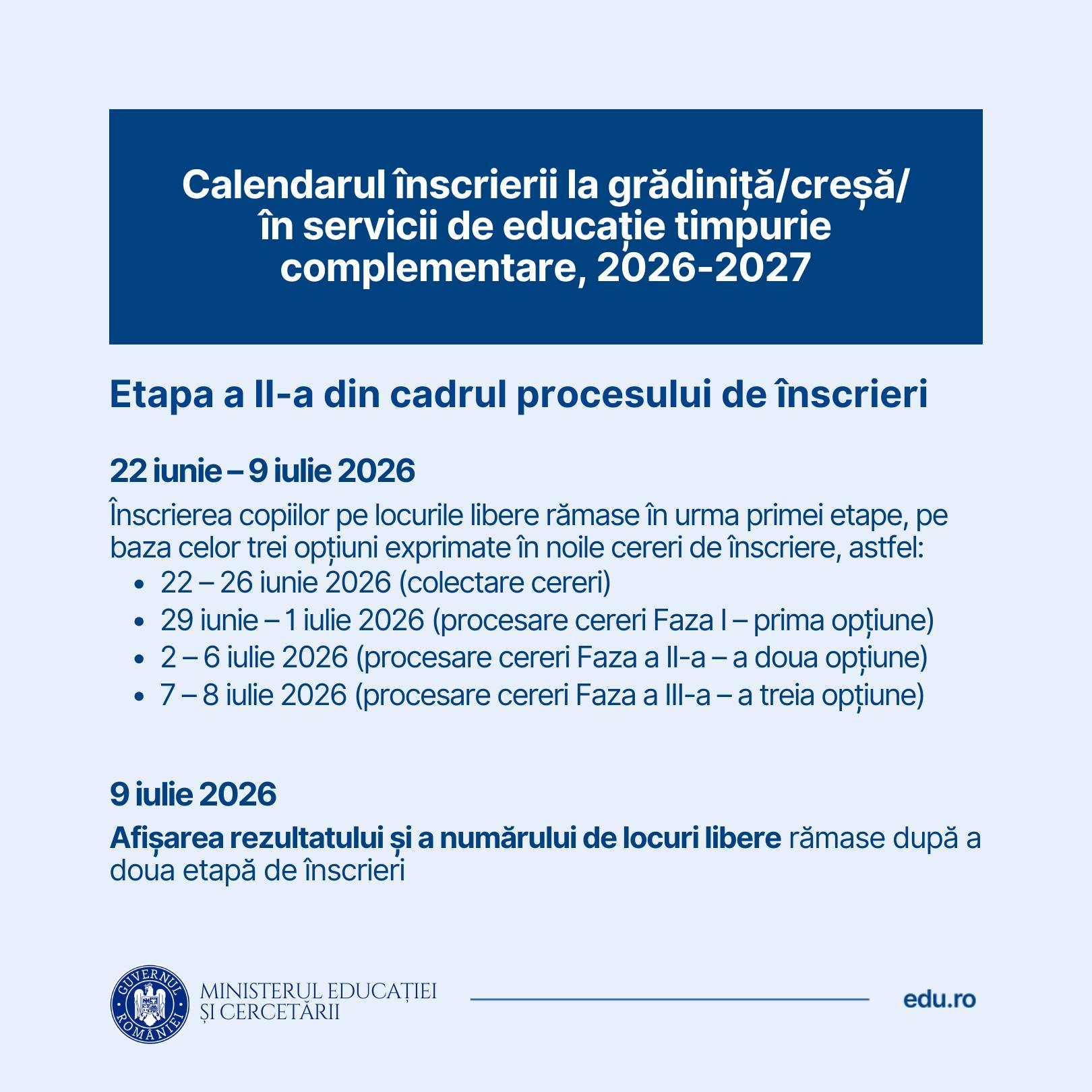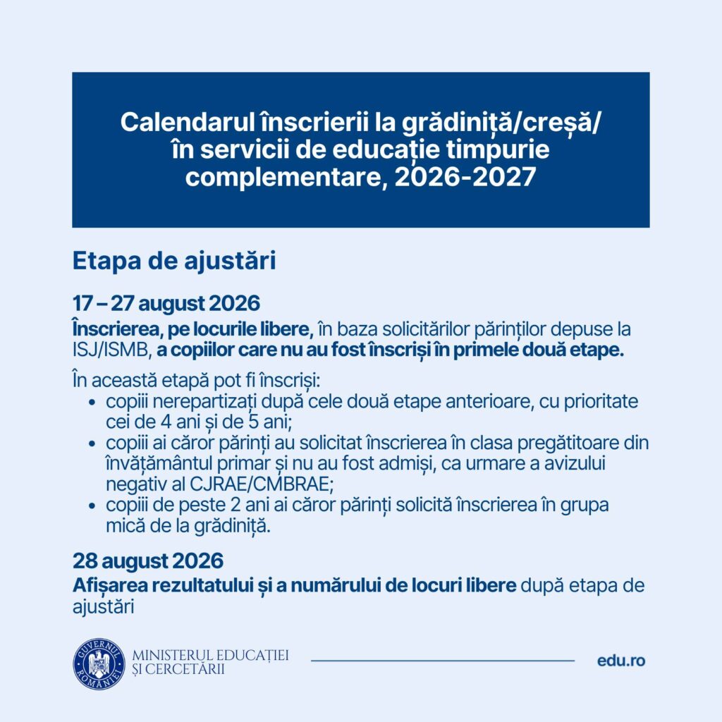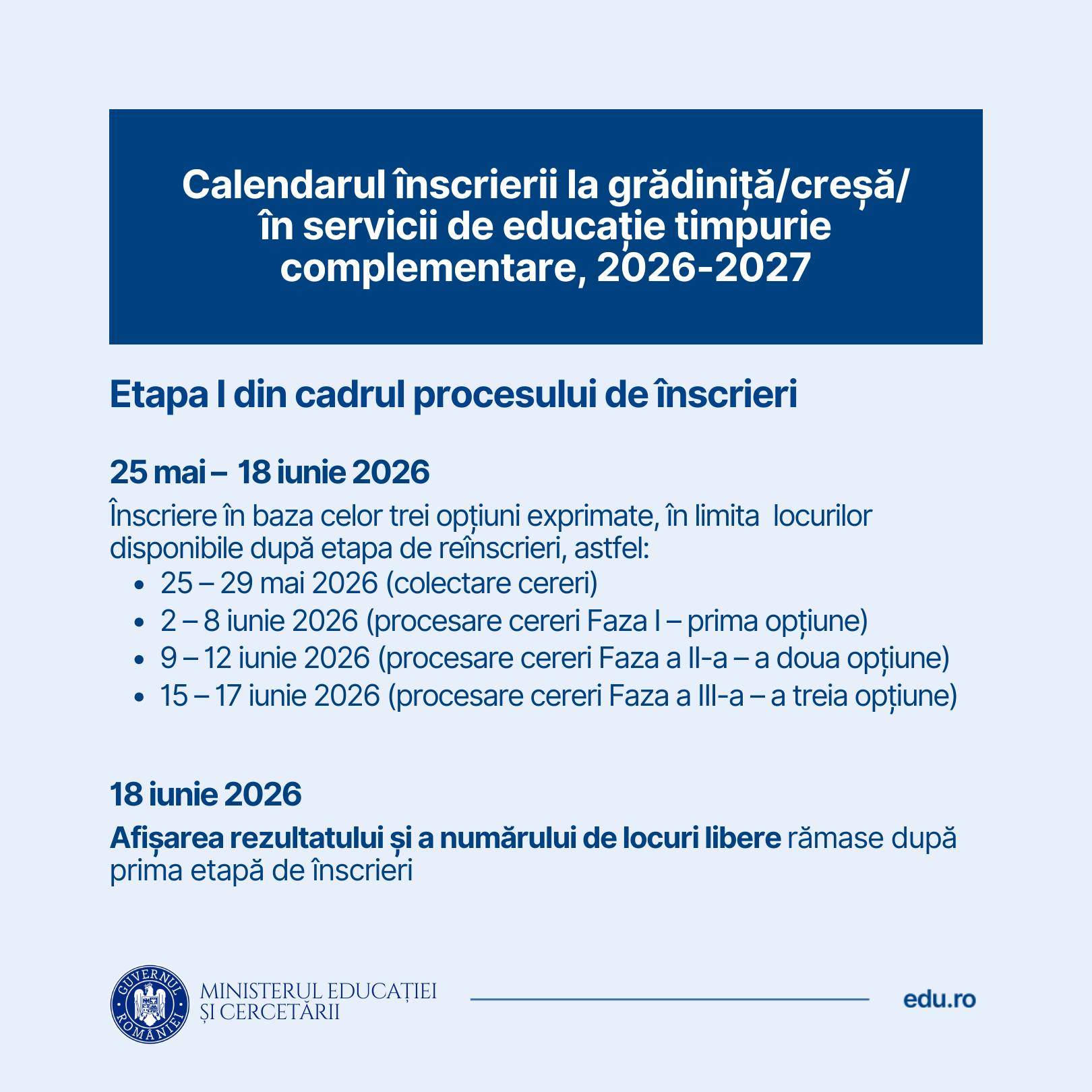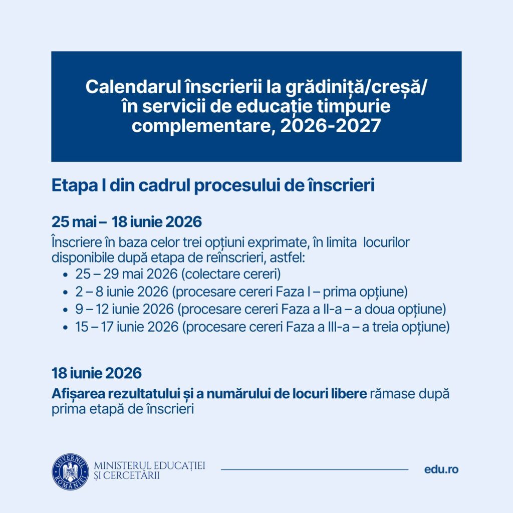 Pentru a sprijini familiile în procesul de înscriere, Ministerul Educației a anunțat că va publica, în perioada următoare, un material în format întrebare – răspuns. Acesta va include principalele informații legate de înscrierea copiilor la creșă, grădiniță și în serviciile de educație timpurie complementare pentru anul școlar 2026-2027.