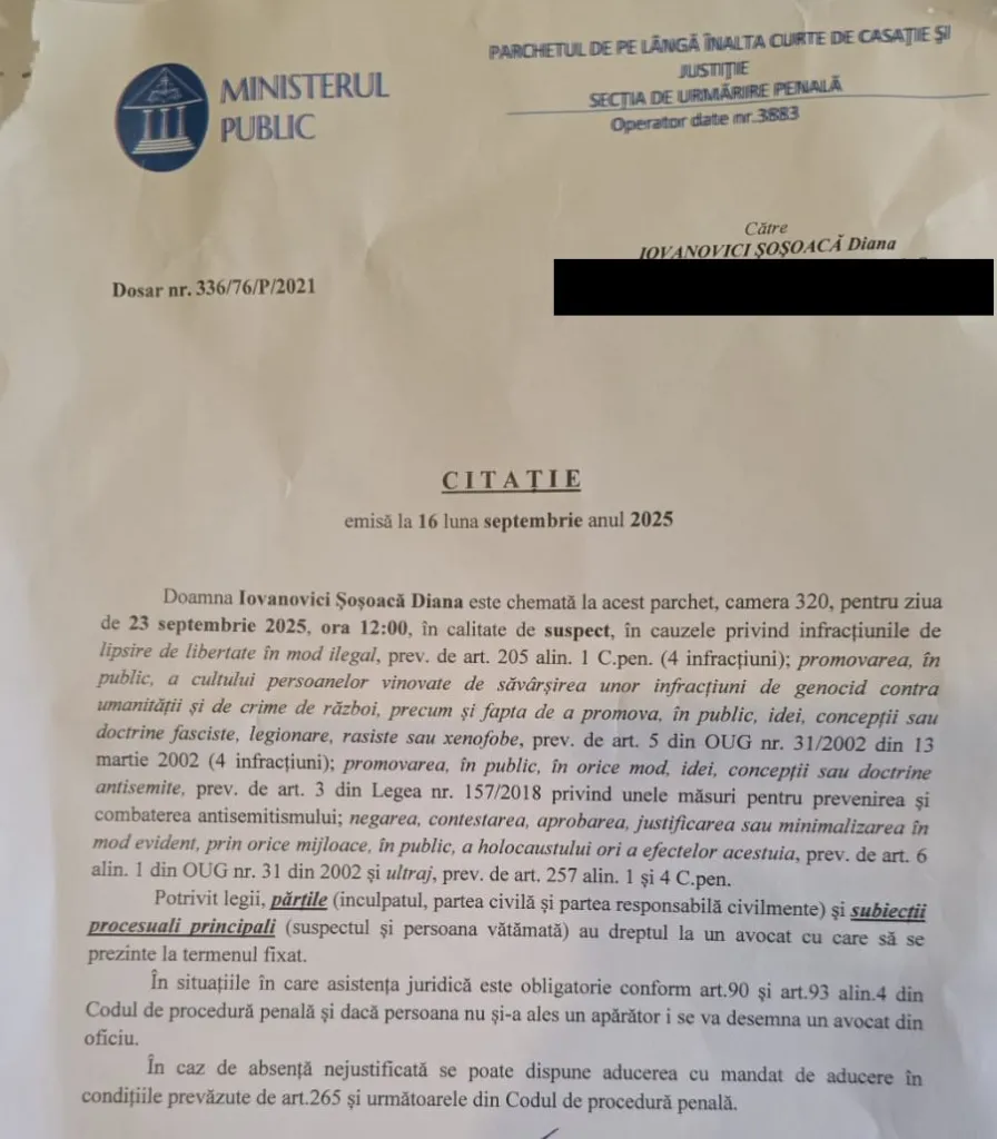 Diana Șoșoacă, liderul partidului SOS România, a fost citată marți la Parchetul de pe lângă Înalta Curte de Casație și Justiție, în calitate de suspect. Conform citației prezentate chiar de europarlamentar într-un clip pe Facebook, audierea este programată pentru 23 septembrie, la ora 12.00.