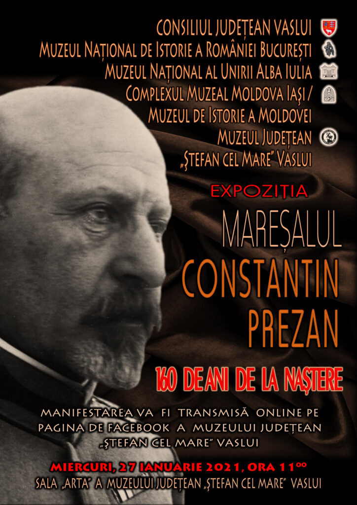 Muzeul Județean „Ștefan cel Mare” Vaslui, aflat sub egida Consiliului Județean Vaslui, vă invită, miercuri, 27 ianuarie 2021, ora 11:00, în Sala „Arta” a instituției, la vernisajul Expoziției „MAREȘALUL CONSTANTIN PREZAN – 160 DE ANI DE LA NAȘTERE”. Expoziția, organizată în colaborare cu Muzeul Național de Istorie a României București, Muzeul Național al Unirii Alba Iulia și Muzeul de Istorie a Moldovei din cadrul Complexului Muzeal Național Moldova Iași, este dedicată împlinirii a 160 de ani de la nașterea celui care a fost mareșalul Constantin Prezan. Personalitate marcantă a istoriei poporului român, mareșalul Constantin Prezan face parte din galeria marilor oameni de stat care au contribuit la înfăptuirea și menținerea actului Unirii de la 1 decembrie 1918 la Alba Iulia. Mânat toată viața de o singură ambiție, aceea de a servi țara, și-a dorit o singură răsplată: sentimentul datoriei împlinite.