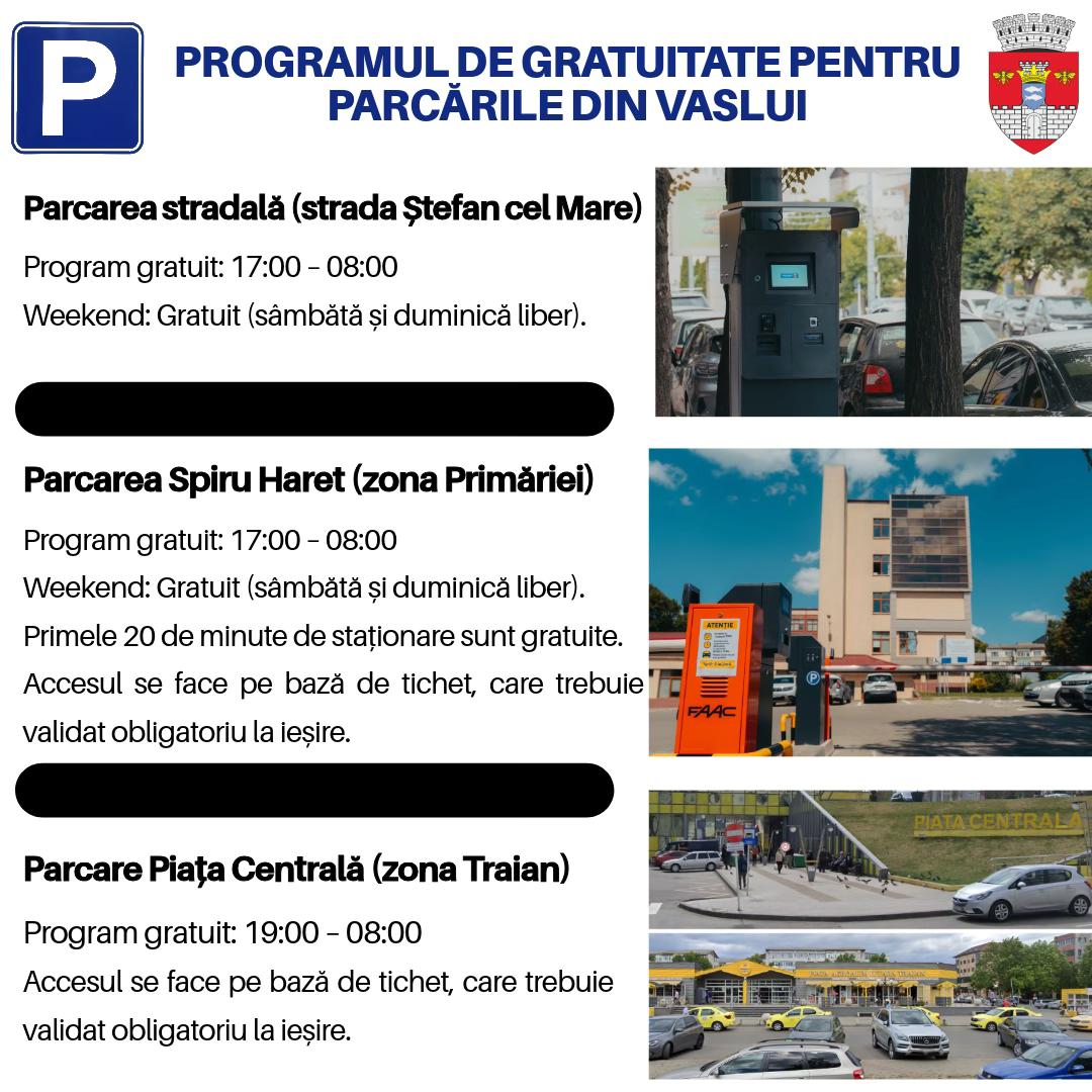 Primăria Municipiului Vaslui, prin Direcția de Piețe, Târguri și Oboare (DATO) Vaslui, a transmis informații privind intervalele orare în care parcările administrate de instituție sunt gratuite, precum și regulile de acces aplicabile în principalele zone din oraș.