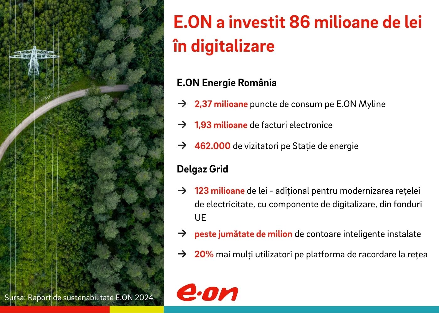 Grupul E.ON din România a publicat Raportul de Sustenabilitate pentru anul 2024, evidențiind investiții majore în digitalizare și modernizarea rețelelor. Anul trecut, compania a alocat 86 milioane de lei pentru dezvoltarea platformelor online și a rețelelor inteligente, iar pentru 2025 bugetul crește cu 19%, până la 102 milioane de lei. În paralel, investițiile din fonduri europene pentru modernizarea rețelelor de distribuție vor ajunge la 155 milioane de lei, față de 123 milioane de lei în 2024.